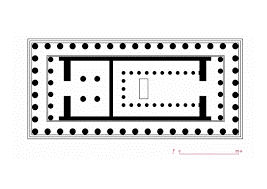 O templo tem uma forma retangular e é períptero, ou seja, possui colunas em todo o seu perímetro.